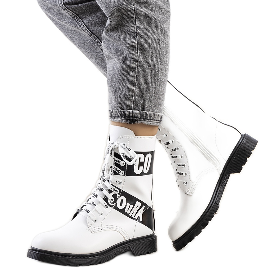 Tyylikkäät saappaat, jotka ovat ihanteellinen täydennys syksy- ja talvityylille. Trapperille tyylitelty malli yhdistää muodikkaan raa'an hahmon, jolla on naisellinen keveys - korkealaatuisesta ekologisesta nahasta valmistettu ylempi valmistettu on sisustettu näyttävällä kirjoituksilla. Pyöristetyn varpaiden ja litteän kantapään (3 cm) ansiosta kengät ovat mukavat päivittäiseen kulumiseen.