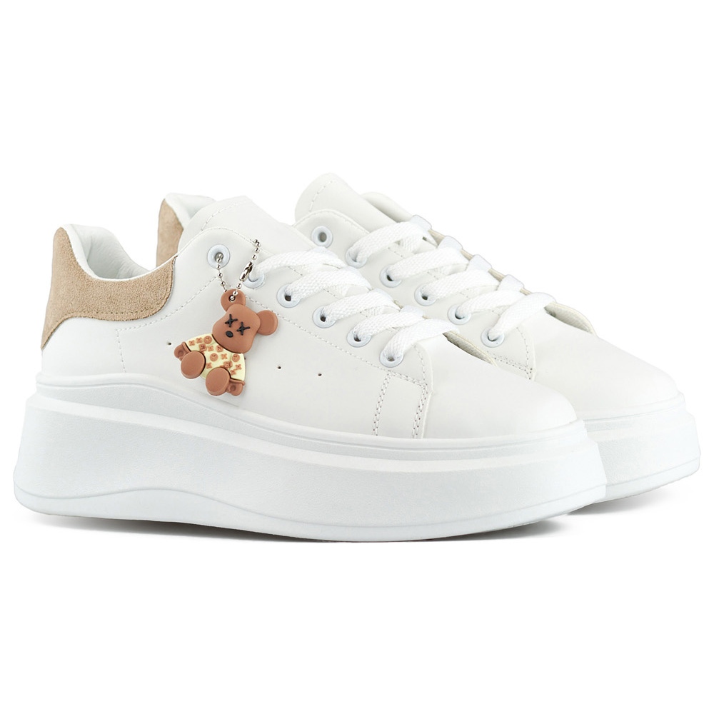 Valkoiset urheilukengät, joissa paksu pohja ja beige nalle valkoinen