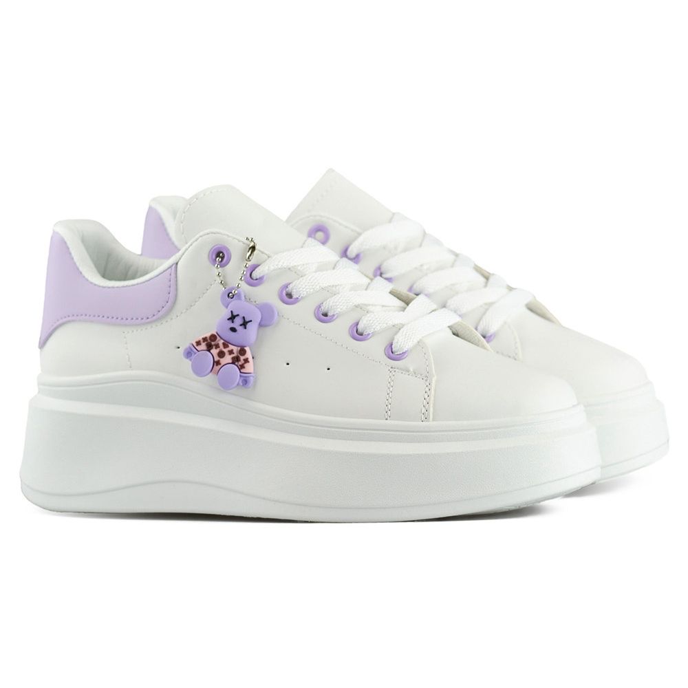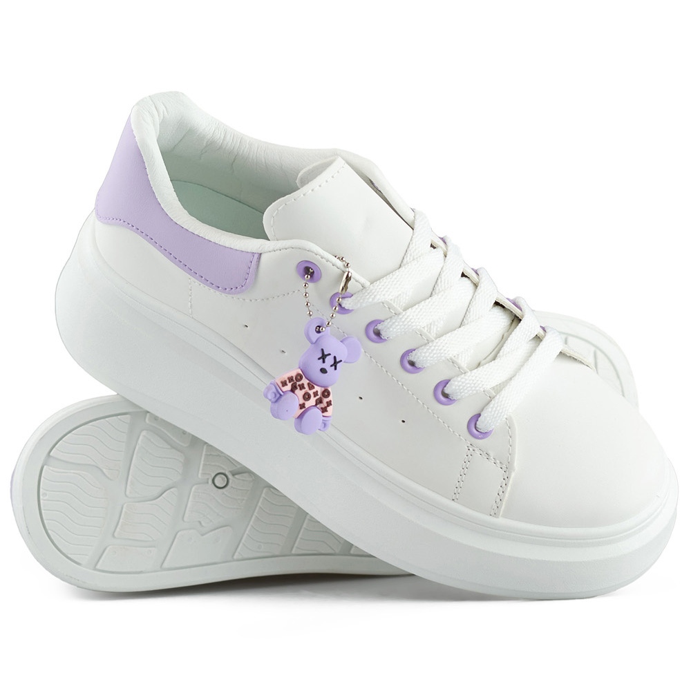 Valkoiset urheilukengät, joissa paksu pohja ja violetti nalle valkoinen