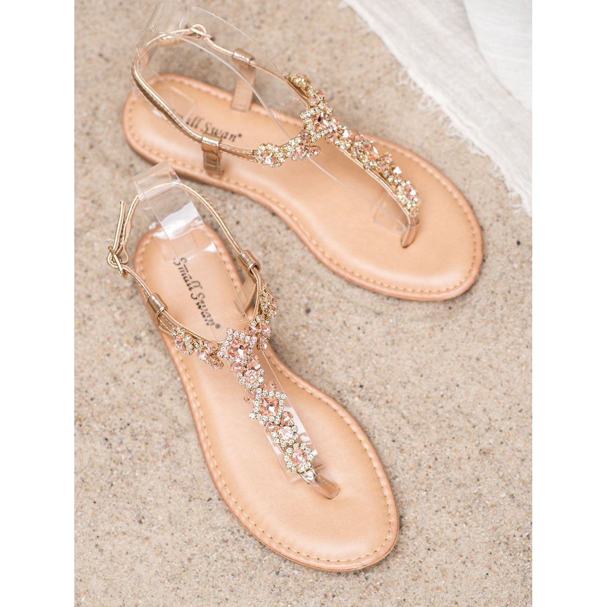 Näitä sandaaleja koristavat strassit herättävät huomion ja antavat niille ainutlaatuisen luonteen, ja niiden kultainen sävy sopii täydellisesti eri asuihin - kevyistä mekoista ilmaviin hameisiin. Sandaalit on valmistettu laadukkaasta keinonahasta, mikä takaa käyttömukavuuden lisäksi myös kestävyyden.