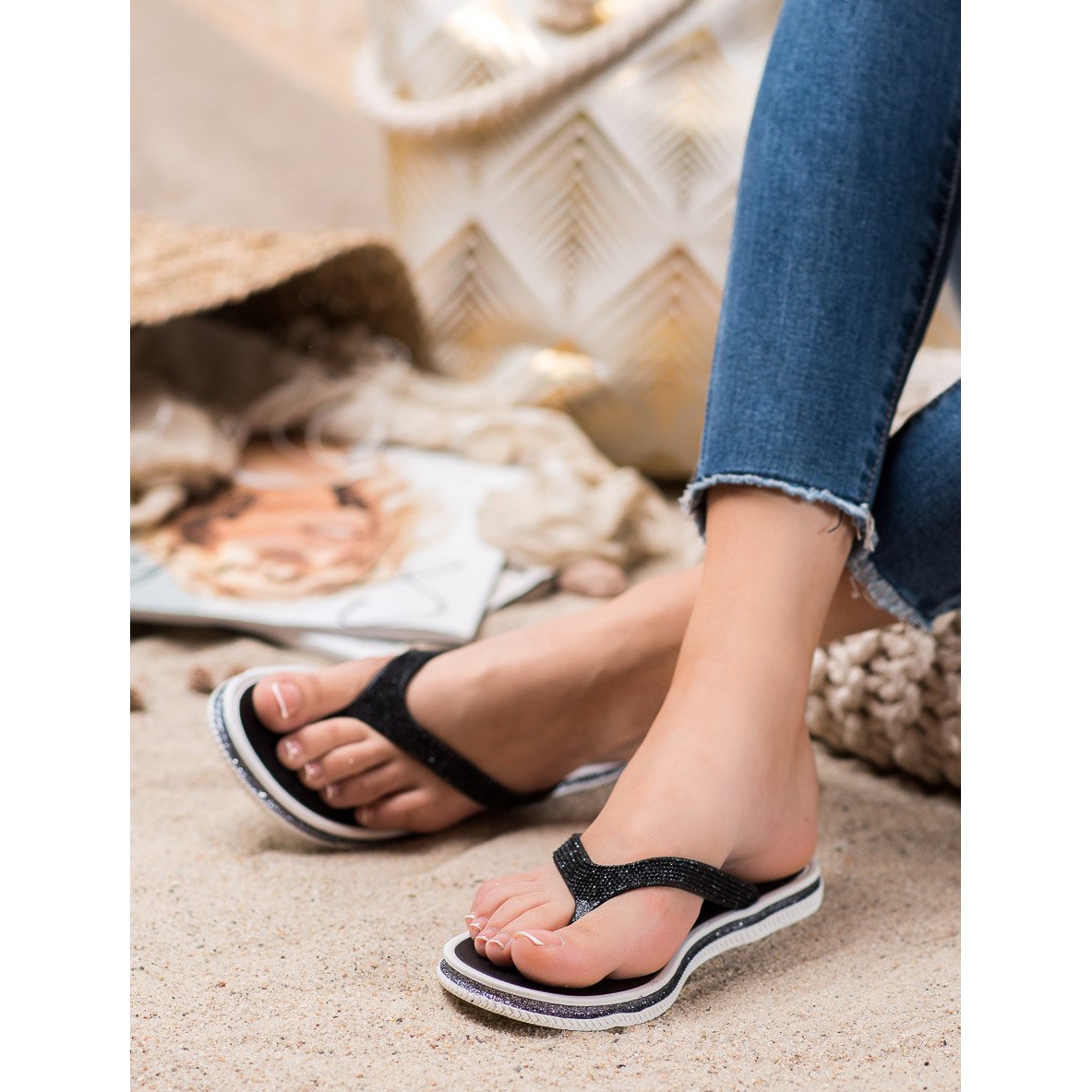 Löydä hämmästyttävä tyyli ja mukavuus Bonan kimaltelevilla varvastossoilla! Nämä tyylikkäät mustat varvastossut ovat täydellinen valinta lämpimiin päiviin, ja ne täydentävät täydellisesti monia arkisia tyylejä. Universaalien väriensä ansiosta ne sopivat täydellisesti sekä kesämekkojen että lyhyiden shortsien kanssa, lisäten jokaiseen lookiin hieman kiiltoa.