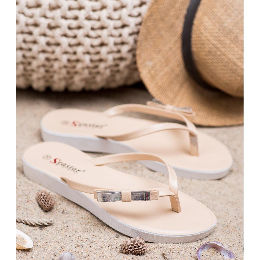 Korkealaatuisista materiaaleista valmistetut Seastar-varvastossut on varustettu litteällä kumipohjalla, joka varmistaa erinomaisen vakauden ja käyttömukavuuden. Pohjan ominaisuuksien ansiosta varvastossut eivät luista kävellessä, mikä on erityisen tärkeää lämpiminä kesäpäivinä. Niiden universaali beige väri ja korkea, 2 cm paksu alusta tekevät niistä täydellisesti yhteensopivia farkkujen, lyhyiden hameiden ja ilmavien mekkojen kanssa.