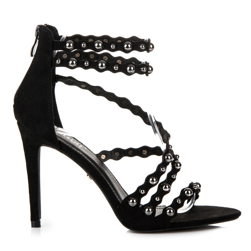 Yksi näiden sandaalien mielenkiintoisimmista elementeistä on niiden runsas koristelu metallisilla, pyöreillä strassilla, jotka lisäävät kenkiin luonnetta ja tekevät niistä paitsi täydennyksen myös muotoilun keskeisen elementin.