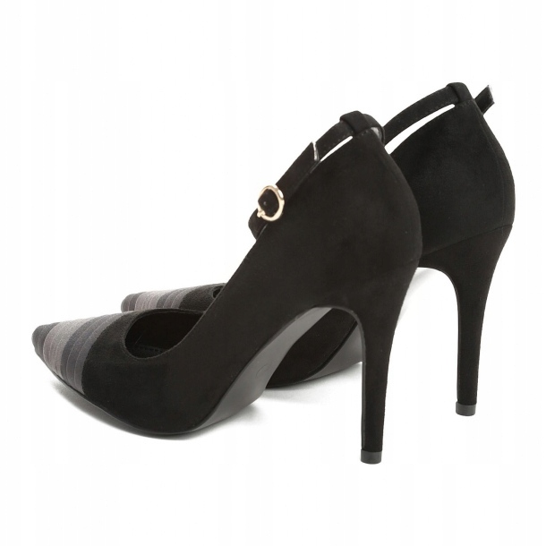 Mustille pumpuille on ominaista voimakkaasti pyöristetty, terävä kärki ja sisäänrakennettu kantapää, mikä antaa niille ainutlaatuisen viehätyksen. Ohut hihna, jossa on lukko, ei ainoastaan takaa vakautta, vaan myös korostaa jalan herkkyyttä. Huomionarvoisia ovat myös varpaissa olevat harmaat raidat, jotka antavat kengille ainutlaatuisen luonteen.