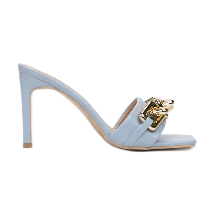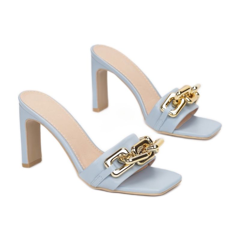 Tyypillinen neliömäinen varvas ja leveä hihna varpaiden ja keskijalan välissä varmistavat täydellisen istuvuuden, ja kullanvärinen ketju koristaa ne ainutlaatuisella tyylikkäällä lookilla. Lisäksi strassit ovat hienovarainen mutta tehokas koriste, joka kiinnittää huomiota ja korostaa jalkineiden eleganttia tyyliä.