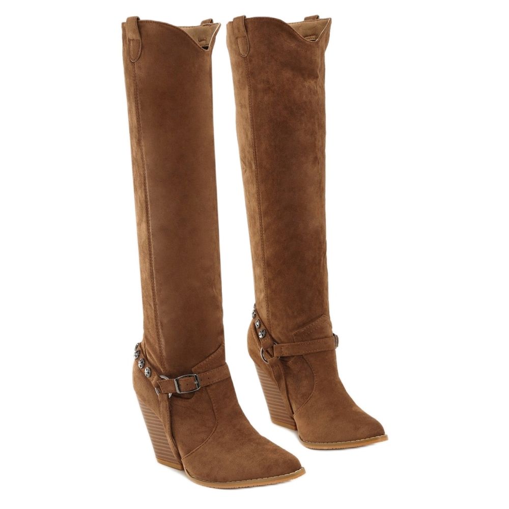 Esittelemme ruskeat Vices 3323-54 cowboysaappaat, jotka ovat täydellinen yhdistelmä tyyliä ja mukavuutta. Nämä laadukkaasta ekologisesta mokkanahkasta valmistetut, polven yli ulottuvat korkokengät kiinnittävät varmasti jokaisen muodikkaiden asusteiden ystävän huomion.