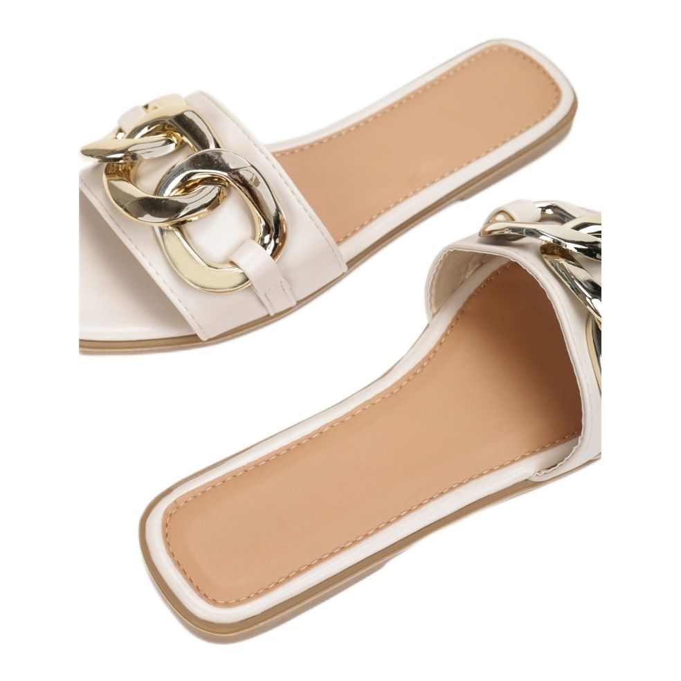 Kätevä slip-on-kiinnitys tekee näistä varvastossoista täydellisen kumppanin niin lämpiminä kesäpäivinä kuin rentouttavina hetkinä kotona. Varpaissa leveä olkahihna, joka on koristeltu hienovaraisesti kultaisella ketjulla, lisää niihin ainutlaatuista luonnetta ja tekee kaikista tyylistä elegantin.