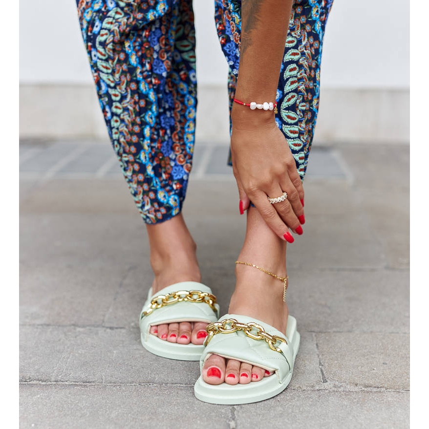 Tutustu Inna Markin ainutlaatuisiin vihreisiin varvastossoihin, jotka on koristeltu Borgo-ketjulla! Nämä tyylikkäät varvastossut ovat täydellinen valinta kesäpäiviin, ja niissä yhdistyvät mukavuus ja muodikkaat aksentit, jotka erottavat sinut joukosta.