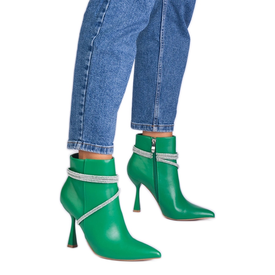 Yksityiskohdat: Vihreät saappaat korkokentällä, joka on koristeltu zirkonilla