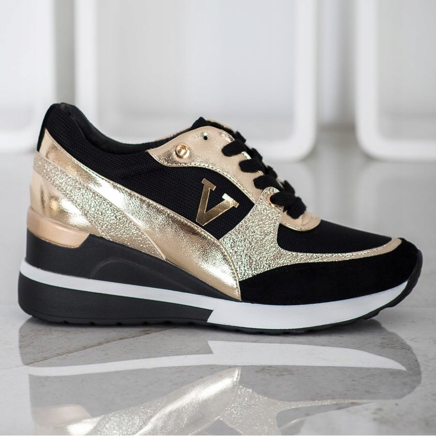 Vinceza wedge -lenkkarit muodikkaassa mustan ja kullan yhdistelmässä ovat ihanteellinen valinta mukavuutta ja tyyliä arvostaville naisille. Ekologisesta nahasta valmistetut klassiset urheilujalkineet yhdistävät modernin muotoilun ja toimivuuden, mikä tekee niistä täydelliset jokapäiväiseen tyyliin.