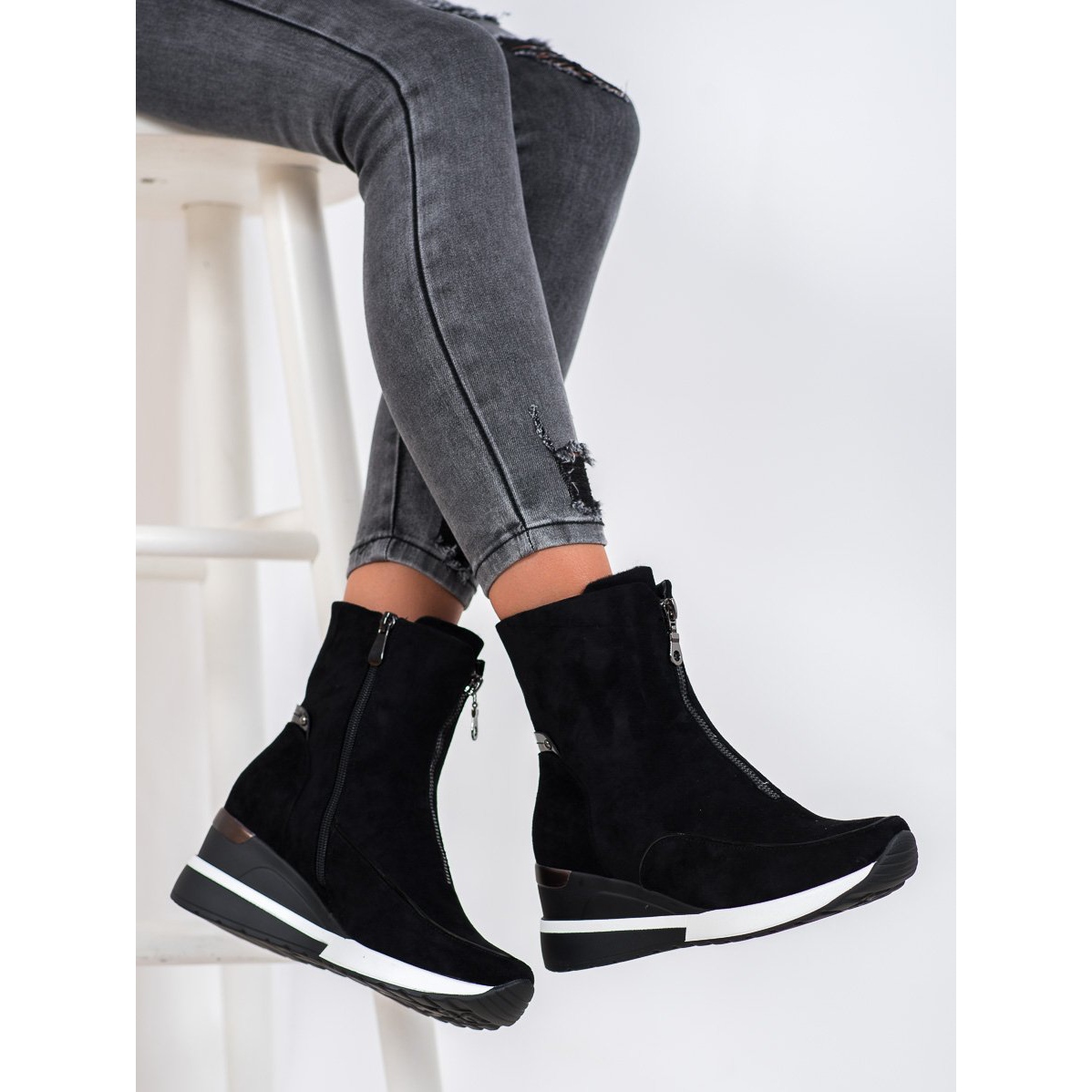 6 cm:n koronkorkeus saa saappaat lisäämään muutaman senttimetrin korkeutta mukavuudesta tinkimättä kiilarakenteen ansiosta. Koristeellinen vetoketju on vaikuttava koriste-elementti, joka erottaa nämä kengät muista.