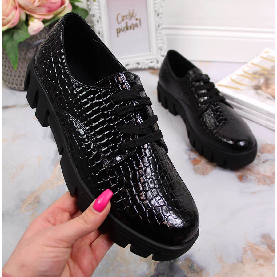 Nykyaikaiset ja tehokkaat Vinceza -kengät ovat yhdistelmä muodikkaita kiiltoa lakattu ekologinen nahka Krokissa. Kuvio, jossa on mukavuus. Malli, jolla on massiivinen, lohkokanta ja hienovarainen alusta, varmistaa siluetin vakauden ja optisen laajennuksen, joka toimii hyvin kaupunkien tyylissä joka päivä.