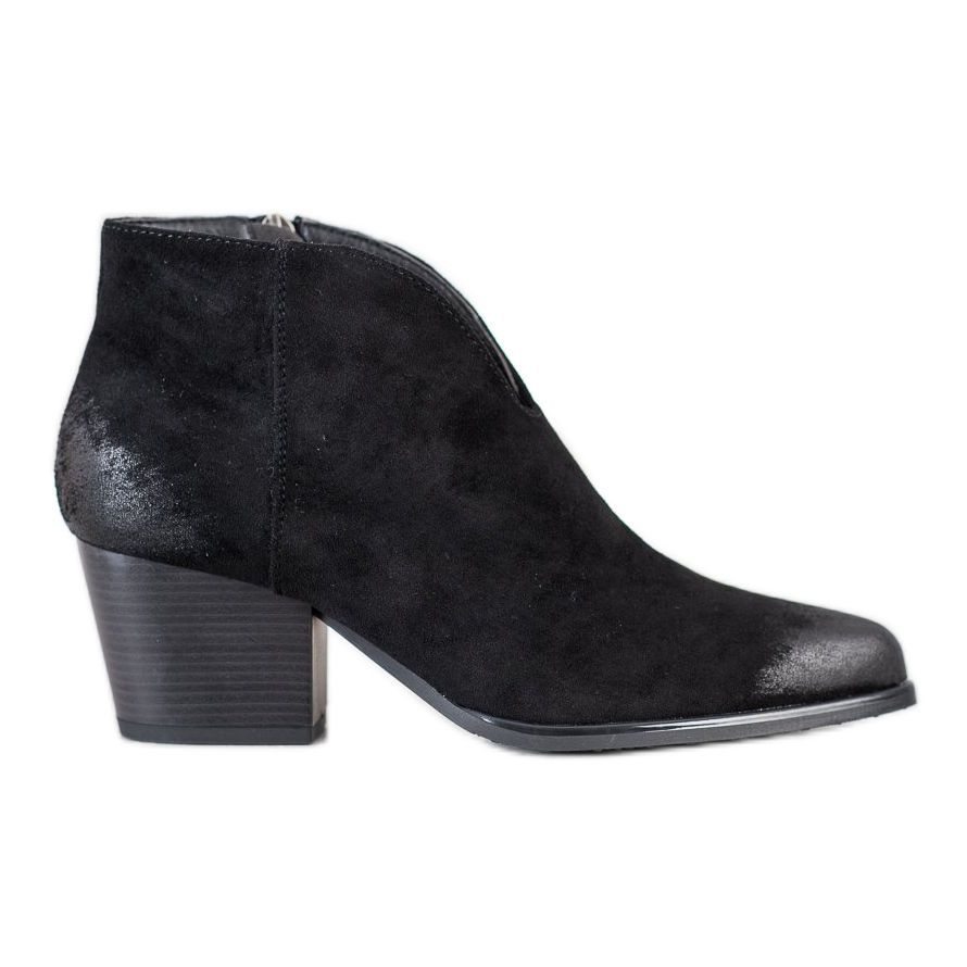 Mustat VINCEZA-lyhyet saappaat ovat täydellisiä jalkineita naisille, jotka arvostavat tyyliä ja mukavuutta. Nämä nilkkurit on valmistettu korkealaatuisesta ekologisesta mokkanahkasta, ja niissä yhdistyy eleganssi ja rento luonne. Pyöreä kärki ja sisäänrakennettu, jäykistetty kantapää takaavat käyttömukavuuden, ja vetoketju helpottaa pukemista ja riisumista.