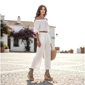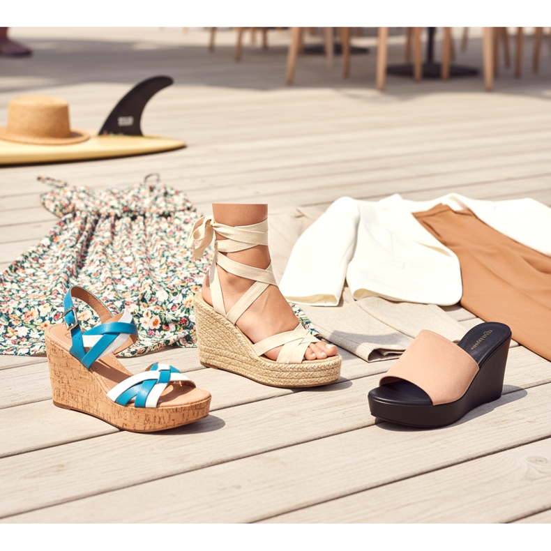 Kesällä kiilakengät toimivat erityisen hyvin - punottu juutti tai korkki ovat luonnollisia, kevyitä materiaaleja, jotka sopivat sesongin tyyliin. Juuttikiilasta on tullut 1970-luvun kesätyylin symboli, joka palaa muodin aika ajoin. Vuonna 2026 se on yksi kauden tärkeimmistä trendeistä.