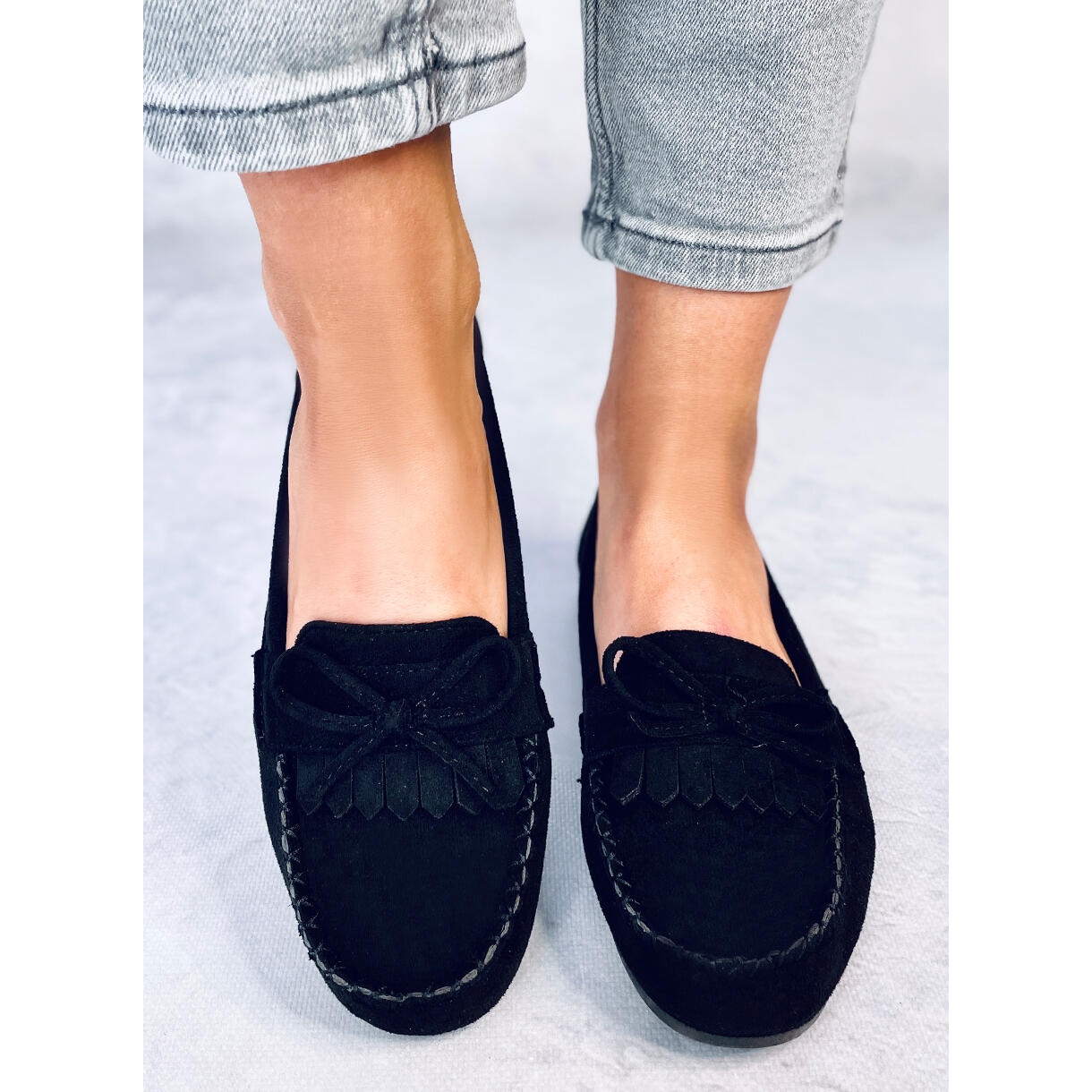 - Klassinen, universaali muotoilu mustassa mokkanahassa vastaa monia asuja.